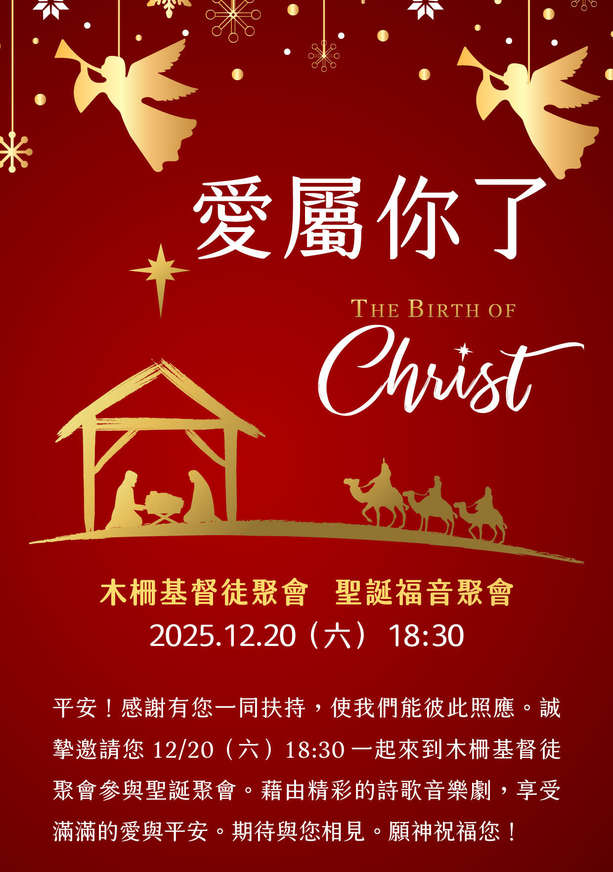-邀請卡- -交通資訊- 木柵基督徒聚會 地址:臺北市文山區木柵路二段57號B1 電話:02-2936-0543 傳真:02-2936-0714 搭乘大眾交通工具 捷運萬芳醫院站出口,過馬路到對面公車站牌 搭乘公車:綠2、611、236、671到馬明潭站,到站後往前走20步左右的左手邊正對面轉角大龍百貨旁大樓B1